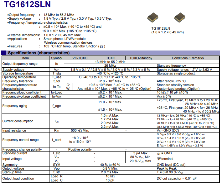 温度补偿晶体振荡器TG1612SLN使用爱普生开发和制造的IC和MHz基本型晶体,可在105℃温度环境下工作并具有待机功能。结合小尺寸,高度低、压力和模制密封阻力的单密封结构的优势,TG1612SLN物联网和工业应用的很好选择。TG1612SLN频率范围:13MHz至55.2MHz,输出方式:削顶正弦波,供电电压:1.7 V至3.63 V(1.8 V ±0.1 V / 2.8 V ±5 % / 3.0 V ±5 % / 3.3 V ±5%)工作温度:-40℃至+105℃。并且TG1612SLN可以兼容ST,支持高标准要求的产品设计,下面J9.COM官方网站电子就给大家分享下TG1612SLN规格书,以供大家选型参考: